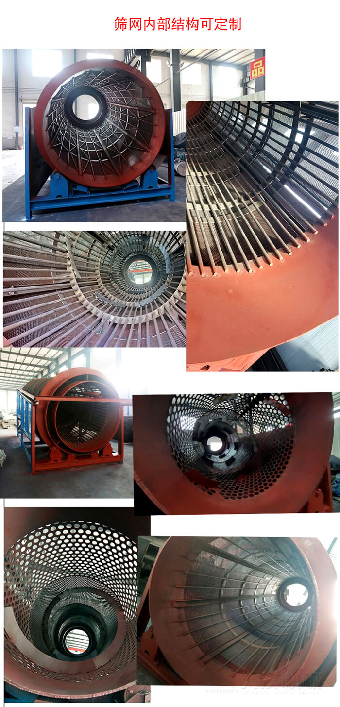 重型滾筒篩的結構相對簡單,主要由滾筒裝置、電動機、減速機和篩網(wǎng)等組成。滾筒裝置傾斜安裝于機架上,電動機通過減速機與滾筒裝置連接,驅動滾筒繞其軸線轉動