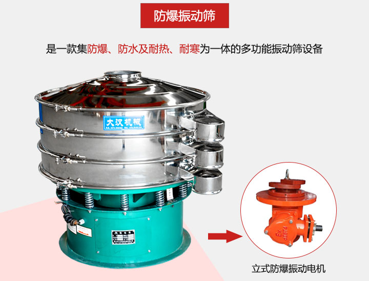 防爆振動篩是針對一些易產(chǎn)生爆炸行業(yè)的研發(fā)設(shè)計而成,是一款集防爆、防水及耐熱、耐寒特殊要求的場合為一體的多功能振動篩設(shè)備,能夠?qū)崿F(xiàn)該功能主要原因是防爆振動篩采用的是立式防爆振動電機