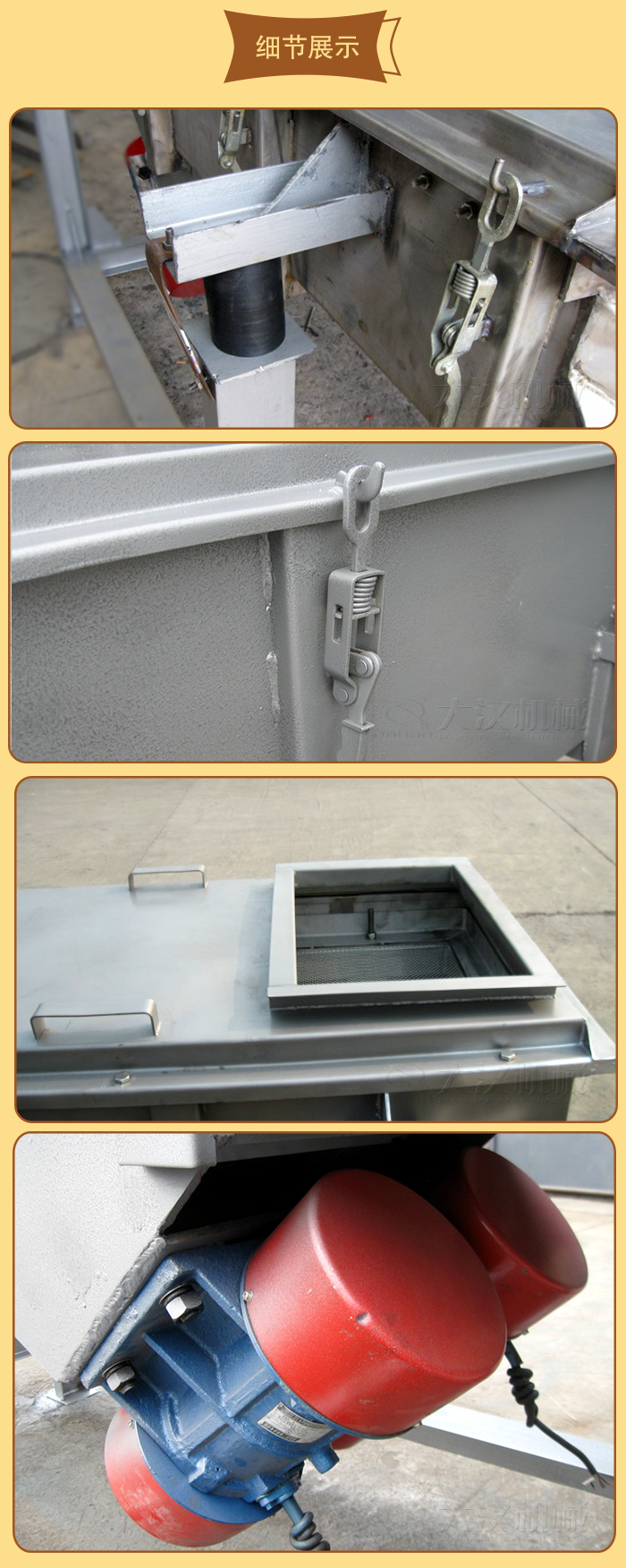 5、電機臺座:安裝振動電機,使用前連接螺釘必須擰緊,特別是新篩機試用前三天、必須反復緊固,以免松動造成事故。